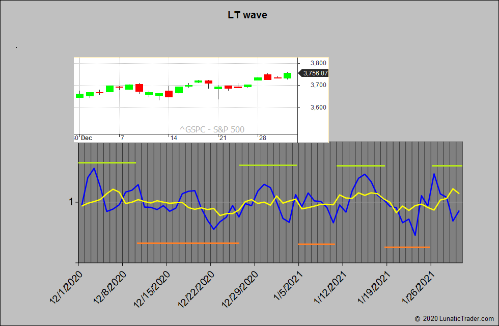 The LT wave did a good job in December. The projected strong start of the month took the index above 3700 for the first time. The expected subsequent weakness until the 26th gave us a sideways choppy market. The stronger final days came right on target as well and allowed the S&P 500 to close the year at new all time record highs.