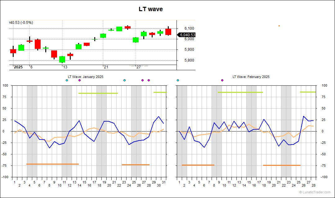 The first few days were positive, as expected. Then the market dipped in the second week, as the wave had indicated. The more positive period starting from the 14th came right on the mark as well. The SPX climbed to a new all time closing high on the 23rd, when the strong period was expected to end. Even the rebound attempt in the final days came on time. It doesn’t get much better than that, so don’t take this as a reason to become overconfident in lunar cycles. Here is the LT wave for February: