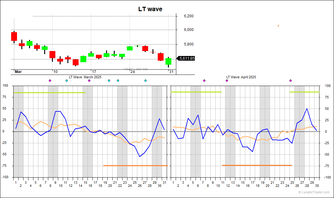 The SPX dropped 400 points in the first two week, when strength was expected. And then rebounded 250 points in what was supposed to be the weaker second half of the month. In the final week those gains were given back, which was in line with the expected weakness. There is no perfection in this kind of work. Here is the LT wave for April: