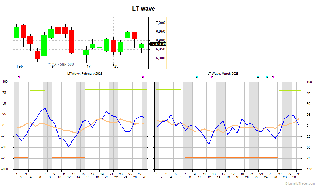 The wave shows strength in the first days, which quickly falls to neutral by the end of the first week. Then three weeks of mostly negative LT wave values. The blue line getting above zero a few time may indicate rebound days, but that will not always work equally well, so use with the necessary caution. The final days of the month are more positive again.