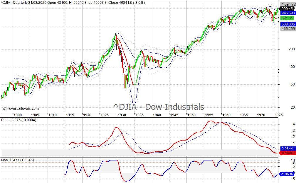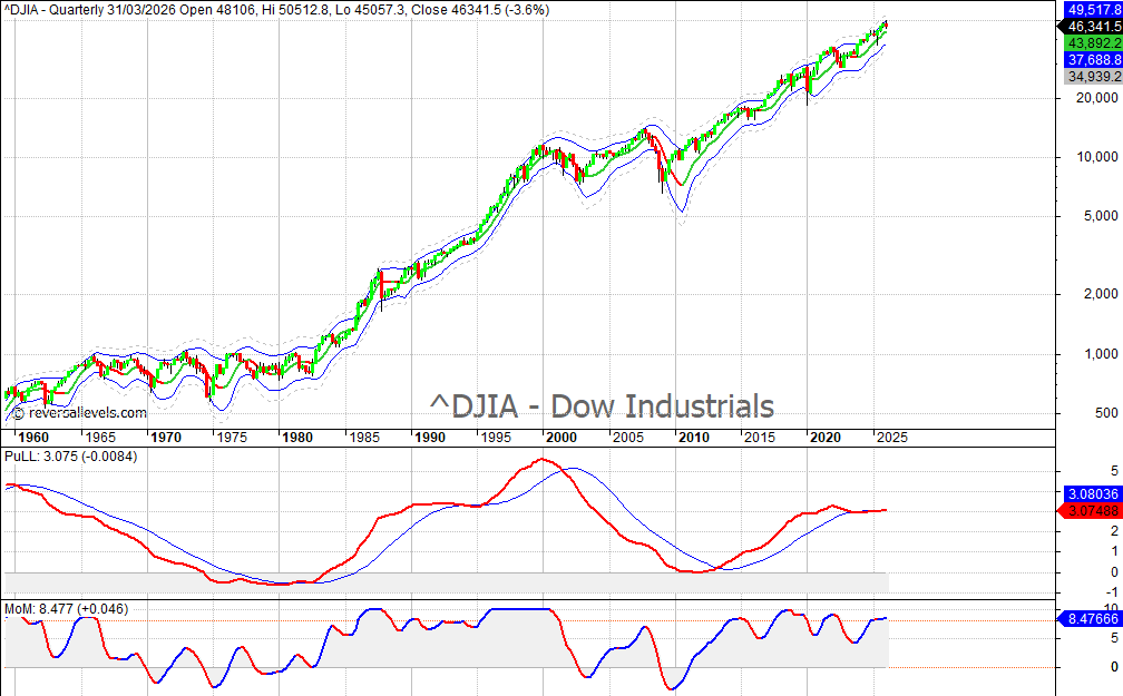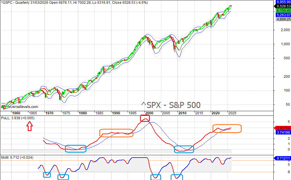 Let’s start with price action. The SPX just had a red quarterly candle, despite the index reaching new record highs during this quarter. Red quarterly candles are pretty rare, and usually followed by a green candle. But whenever you get back to back red quarterly candles after the market reached new record highs, it almost invariable leads in a bigger decline that sees prices fall to the bottom of the Snake (blue line or even dashed line). You can easily spot the historic examples of that in this chart. So if Q2 of 2026 is a red candle too, then it becomes the base scenario that the bottom of the Snake will get a visit. Currently that means around 5263 (blue line), or even 4889 (dashed line) if there is a panic move. So, that’s already something to keep an eye on in the coming months.