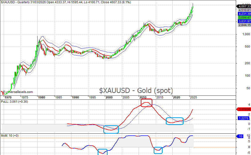Try to do most of your long term buying near MoM lows below zero. That was 2002 and 2016. Keep an eye on PuLL for a possible long term top. That was 2012. It is clearly too early to consider a long term top right now, as PuLL is still climbing very fast and MoM is at +10.